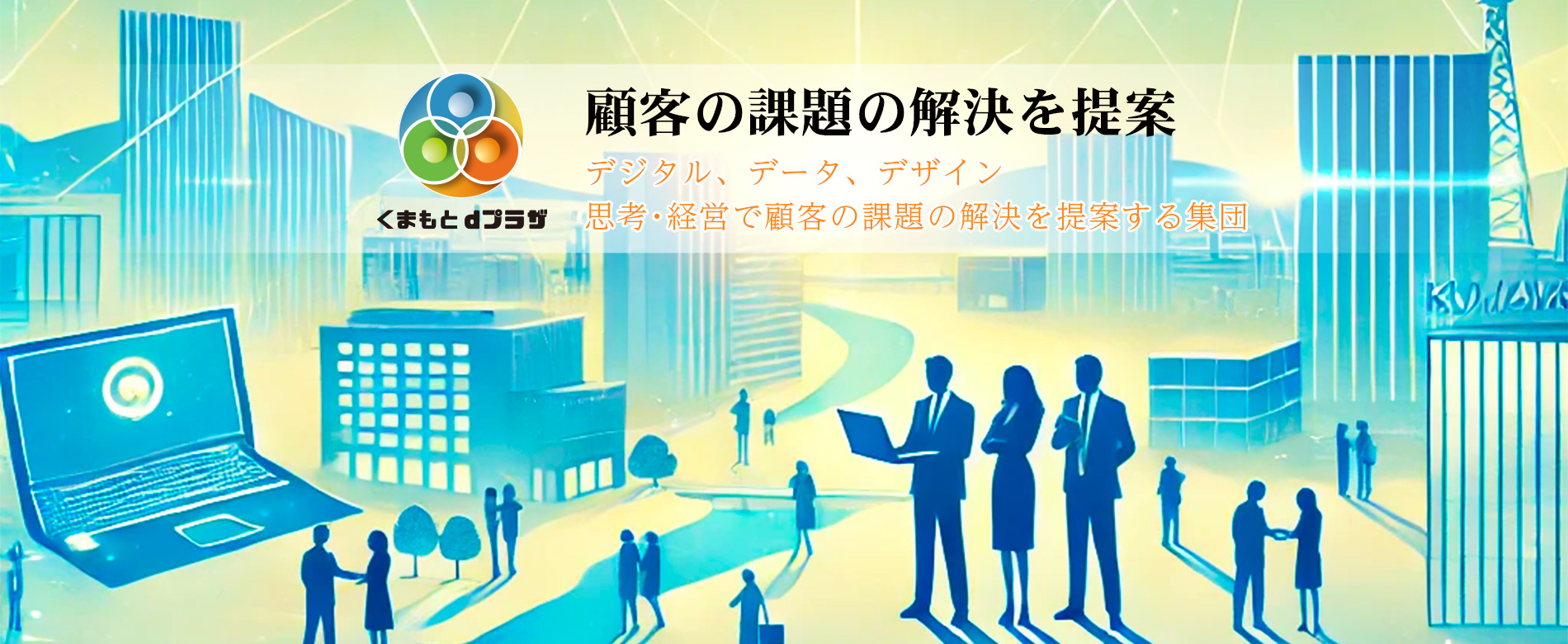 くまもとdプラザは、顧客のニーズやウオンツを把握するデザイン思考を出発点として、社内外のデータとIT・IoT・AI・通信等のデジタル技術を活用して、ソリューションを提供するとともに、そのプロセスを持続的に進めるための組織改革や企業戦略に統合する広範な取組みであるデザイン経営を目指します。